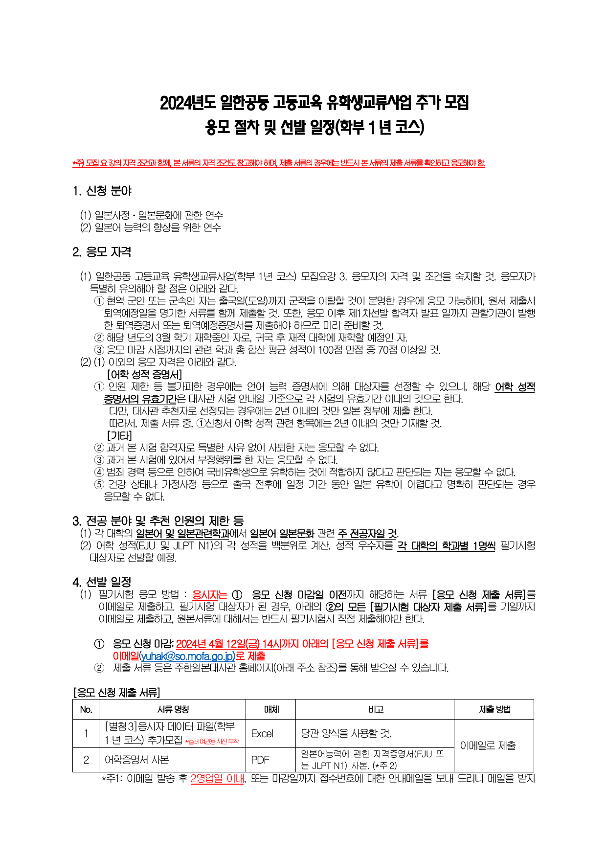 (붙임 2) 2024년도 일본 정부(문부과학성) 초청 일한공동고등교육 유학생 교류사업(학부1년 코스) 추가 모집절차 및 모집일정.pdf