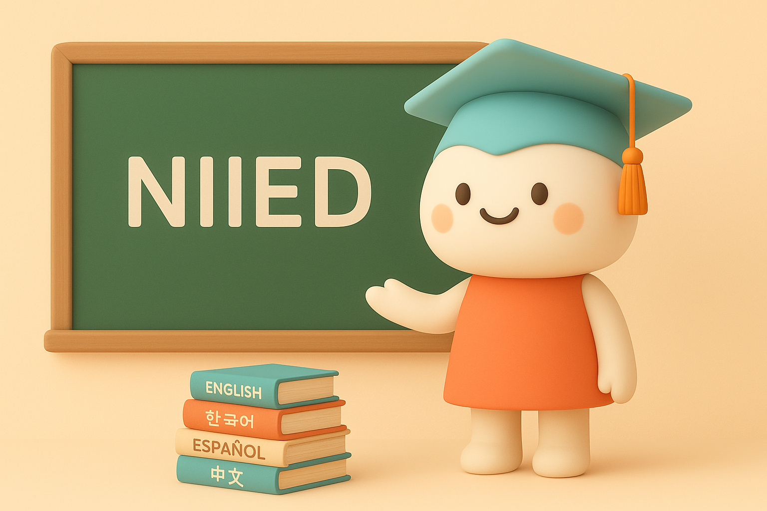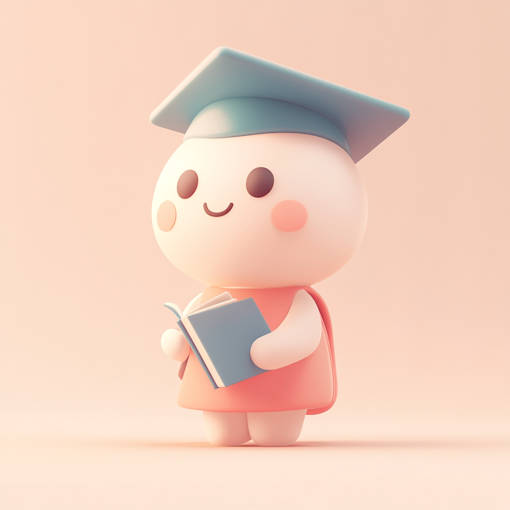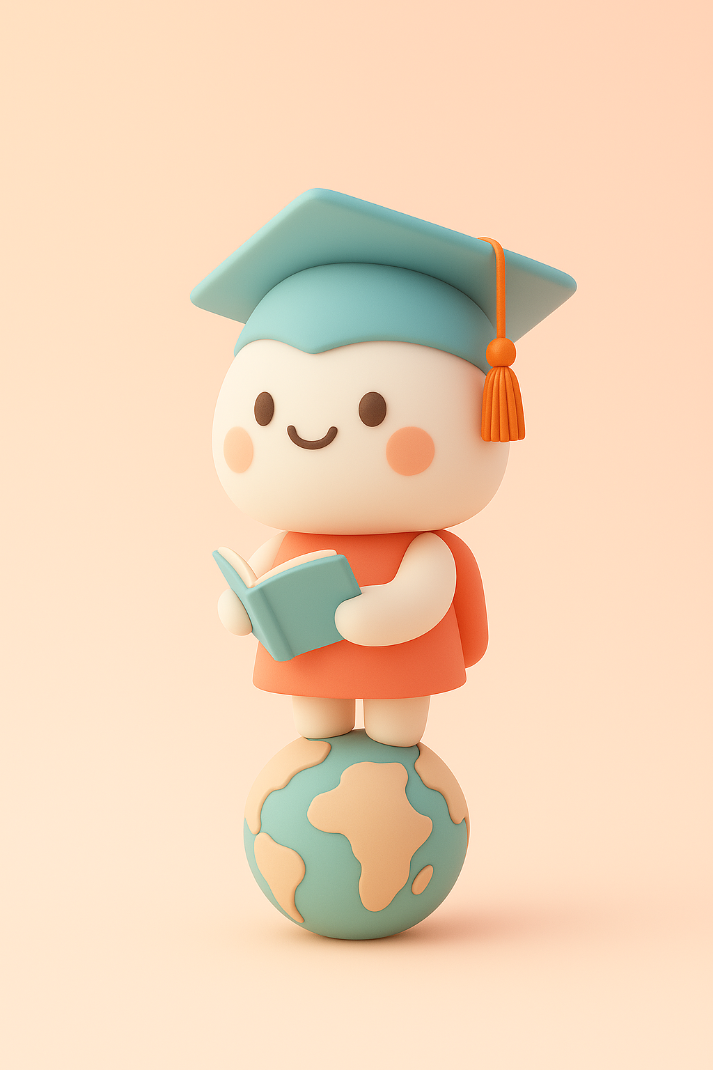 - A cute, gender-neutral character representing international education, with a simple and memorable design. The character has a round face, dot eyes, a big warm smile, and is wearing a blue graduation cap. They are holding a small book and have a soft, pastel-colored outfit (orange and blue tones). minimalistic, adorable, highly recognizable, clean background, character-focused.