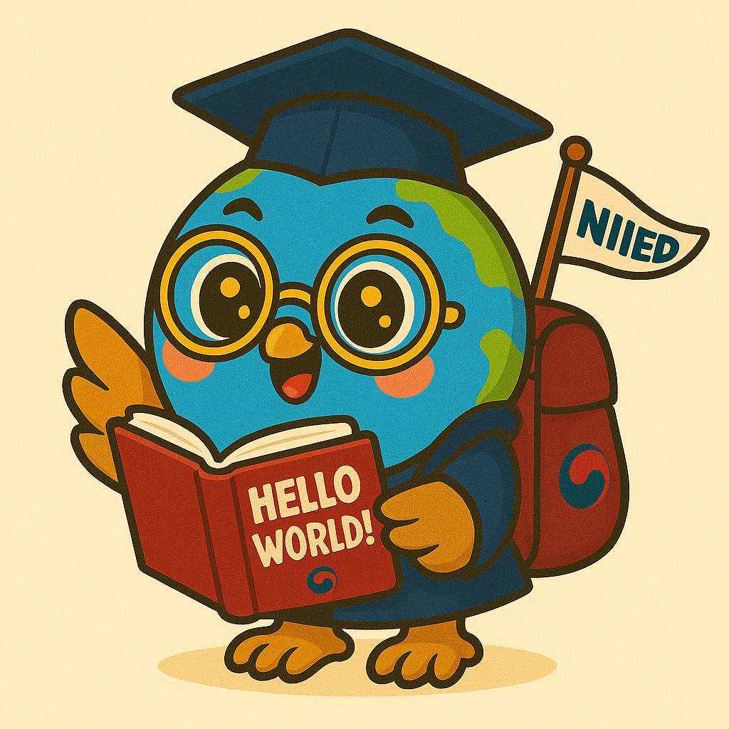 - 지혜와 학문의 상징인 부엉이+지구로 태어난 에디는 국립국제교육원의 GKS, TOPIK, WEST, 교육 교류 사업 등을 통해 지식을 품은 글로벌 미래 인재로 성장하고자 항상 교육원 책자를 읽고 있음