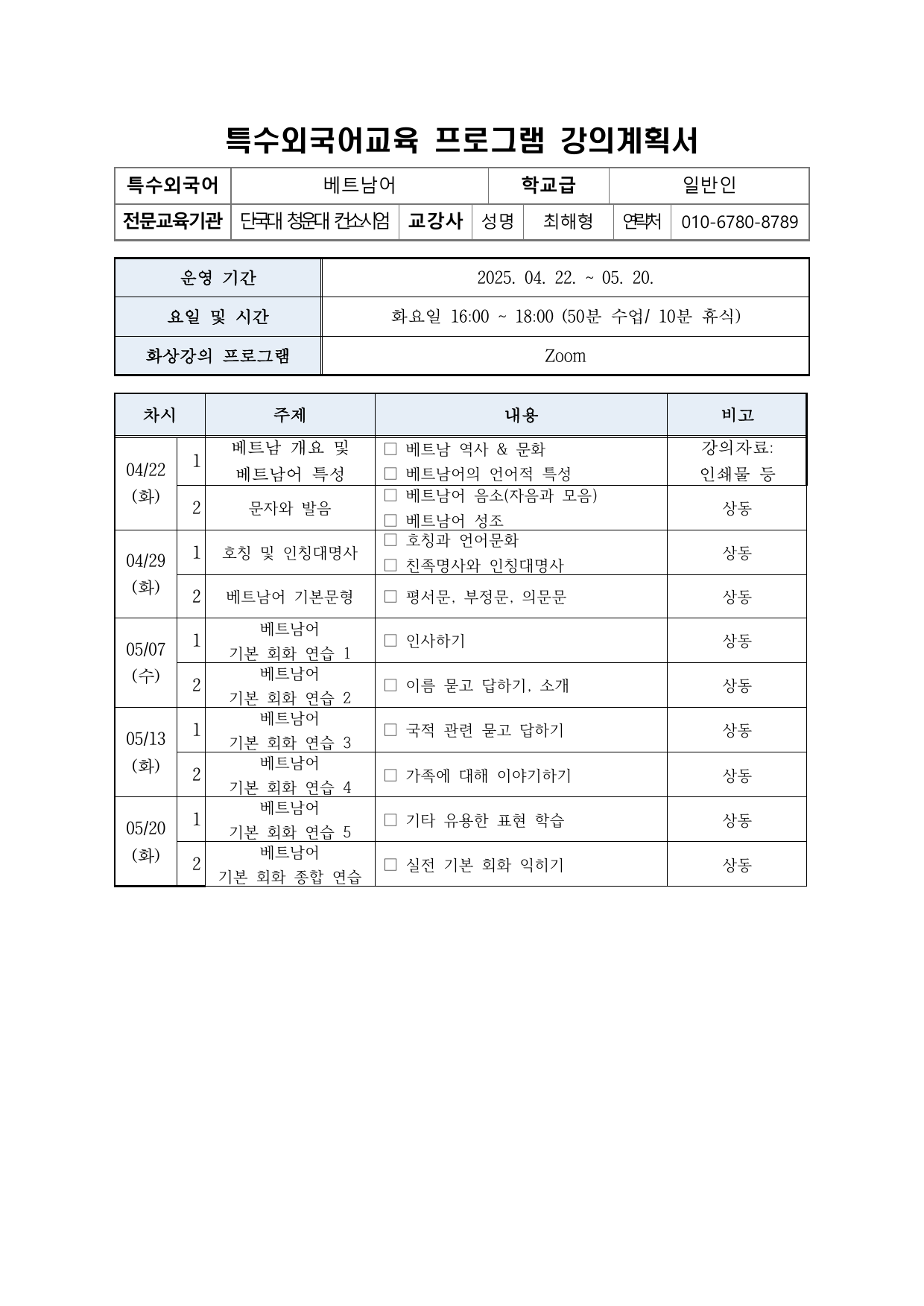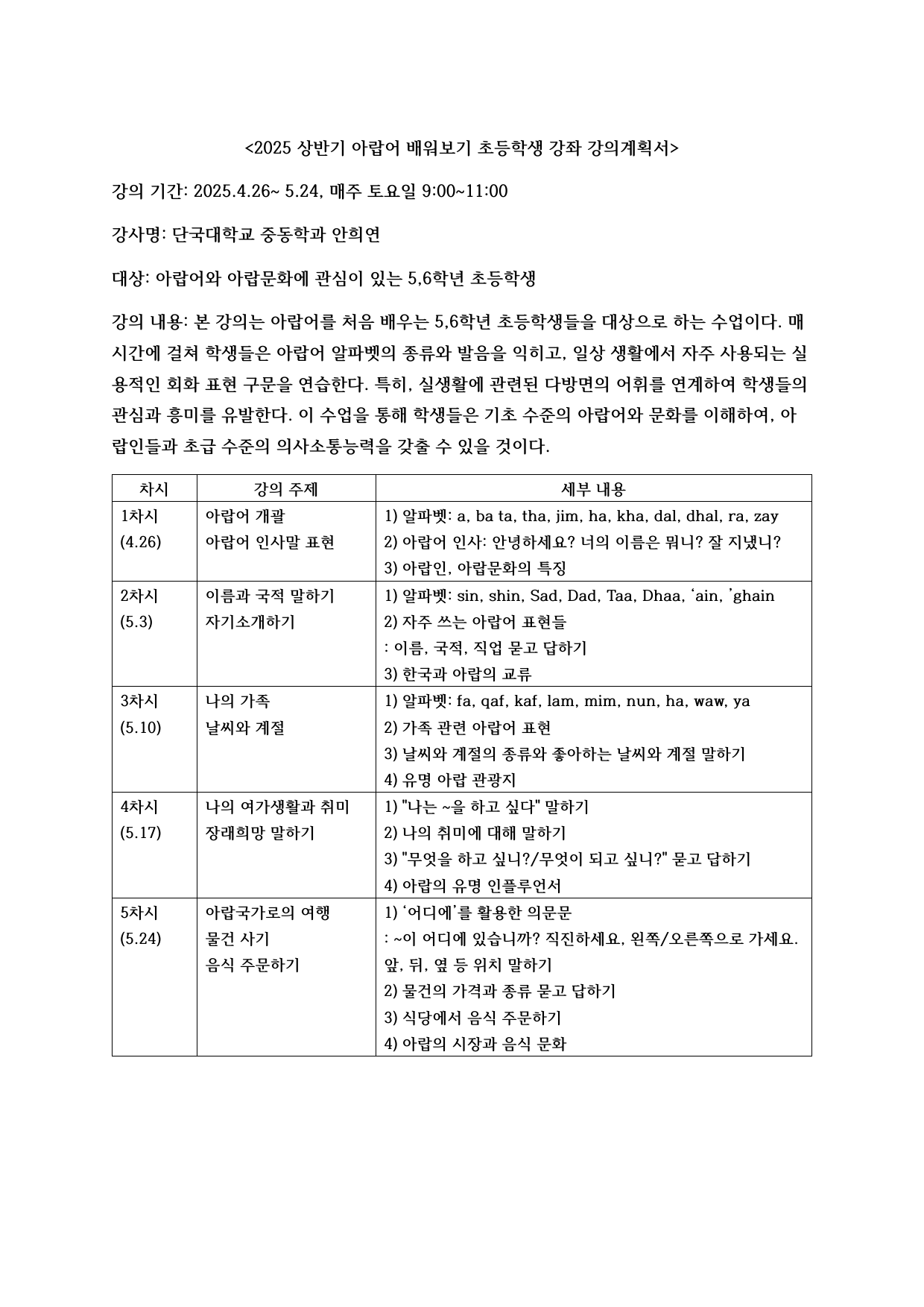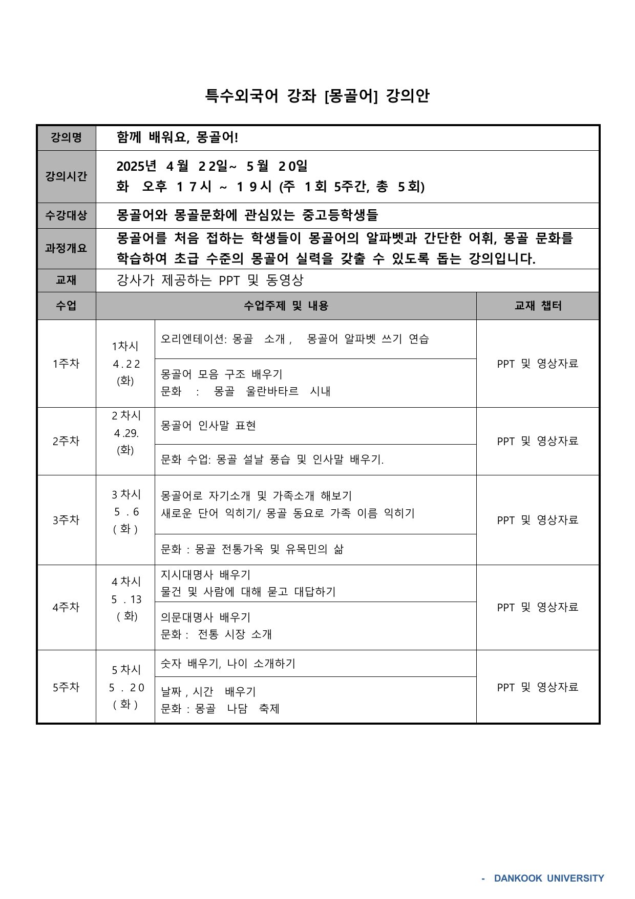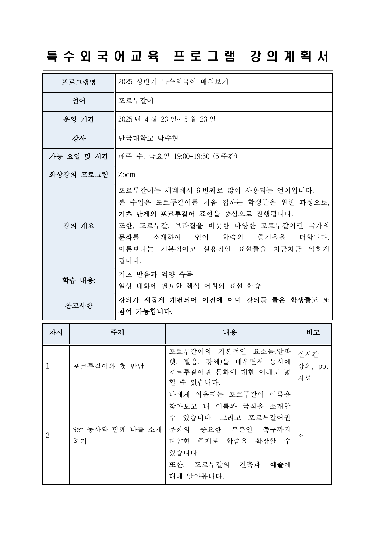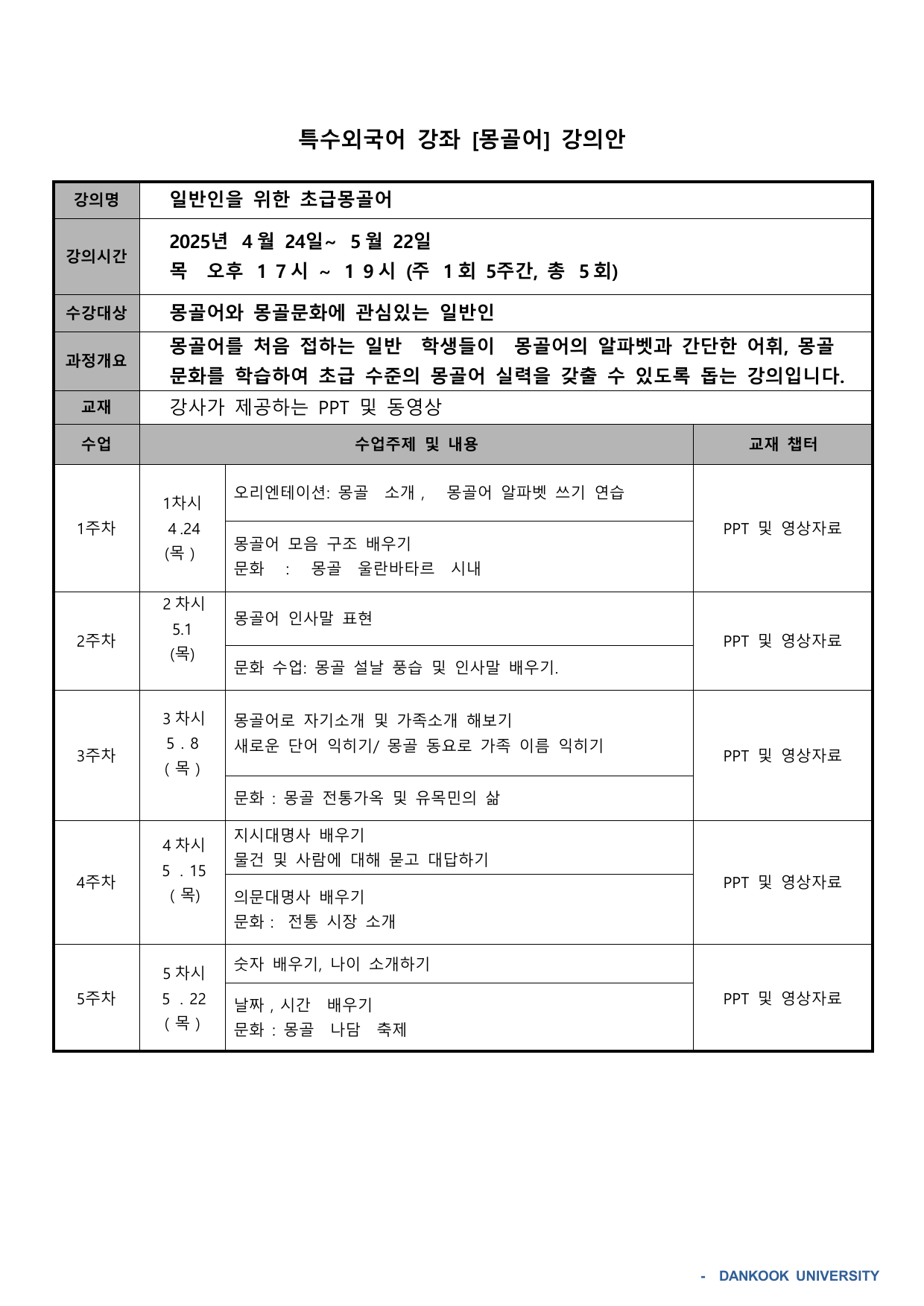 2025 상반기 단국대학교 특수외국어 배워보기 강의계획서 (1~12번 강의)
