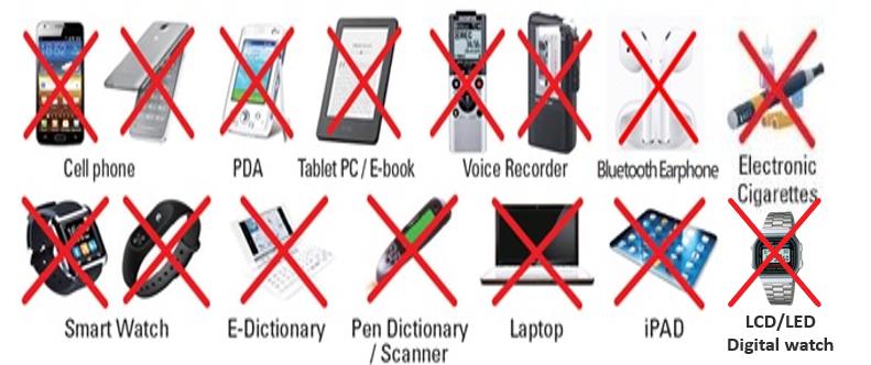 ※ 위 그림에 나열되지 않았더라도, 휴대전화, 스마트기기(스마트워치, 스마트안경 등), 디지털 카메라, 전자사전, MP3 플레이어, 태블릿PC, 카메라펜, 전자계산기, 라디오, 휴대용 미디어 플레이어, 결제·통신(블루투스 등) 기능 또는 전자식 화면표시기(LCD, LED 등)가 있는 시계, 기타 충전식 물품(전자담배, 보조배터리 등), 통신(블루투스) 기능이 있는 이어폰(「한국어능력시험 장애인 등 편의지원 지침」에 따라 승인받은 보청기는 제외) 등 모든 전자기기는 시험실 반입 금지물품이므로 반드시 전원을 끄고 감독관에게 제출해야 합니다.