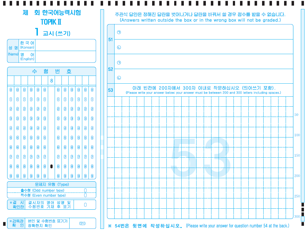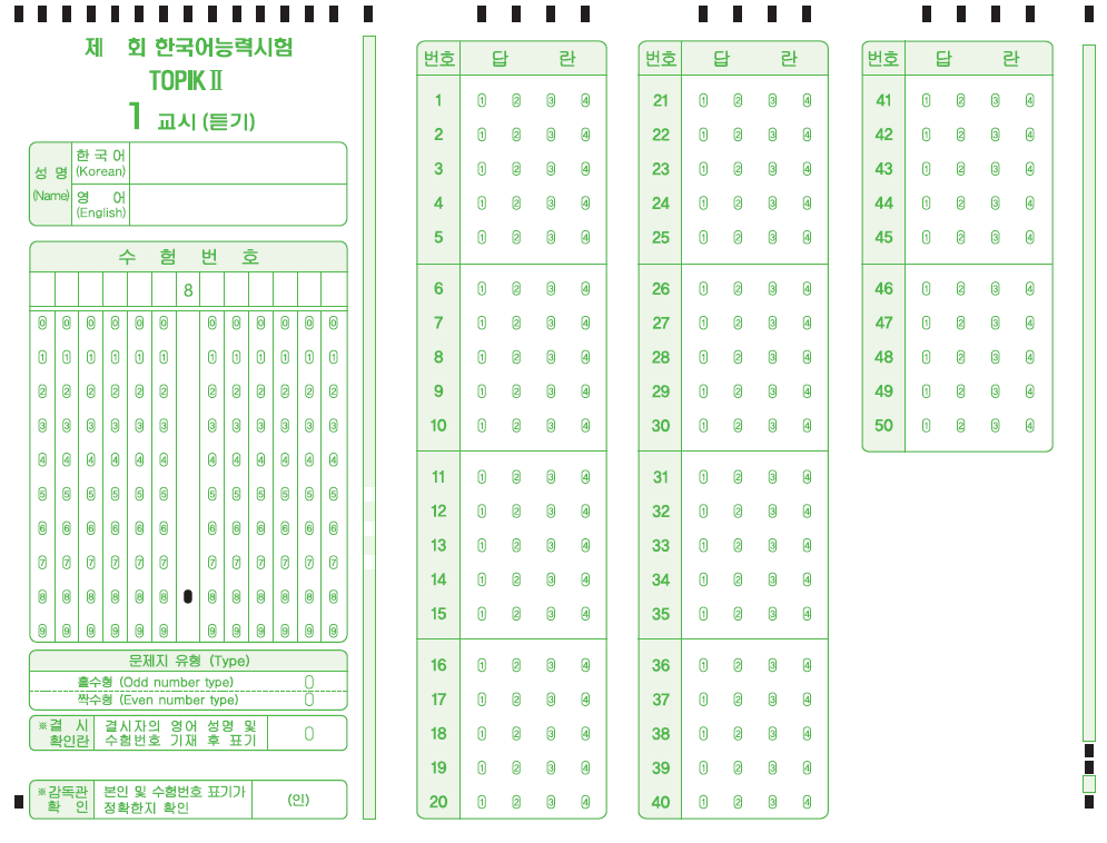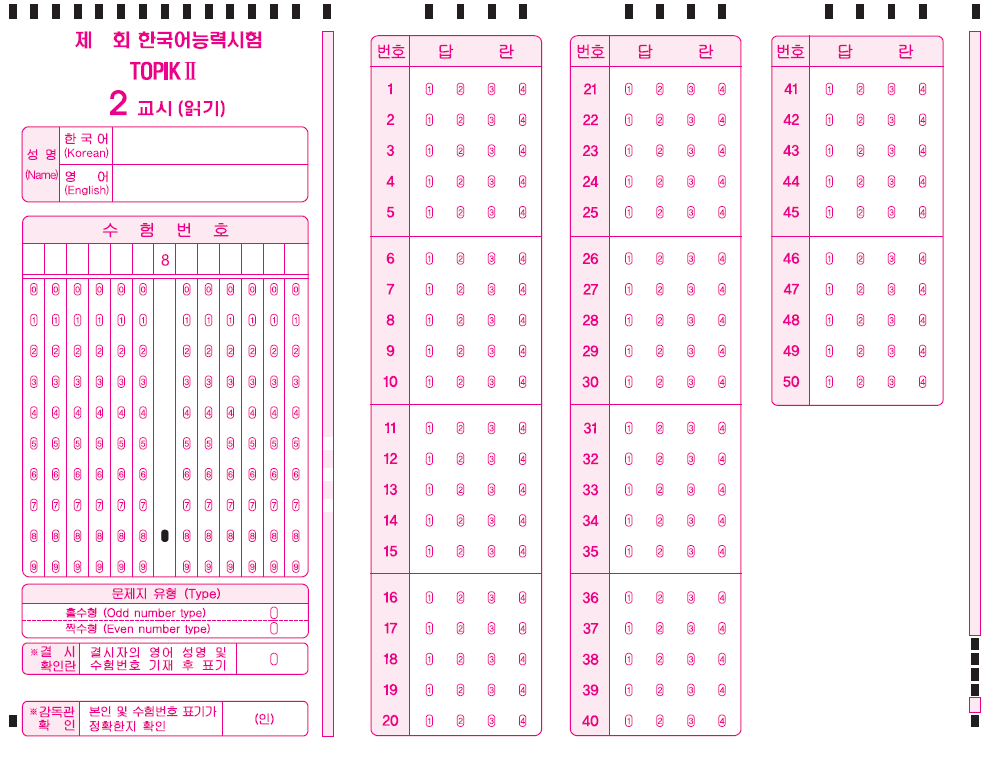 - 토픽 Ⅱ PBT의 경우 1교시 답안지가 2장이며, 2장 모두 응시자 정보를 기입하여야 합니다.