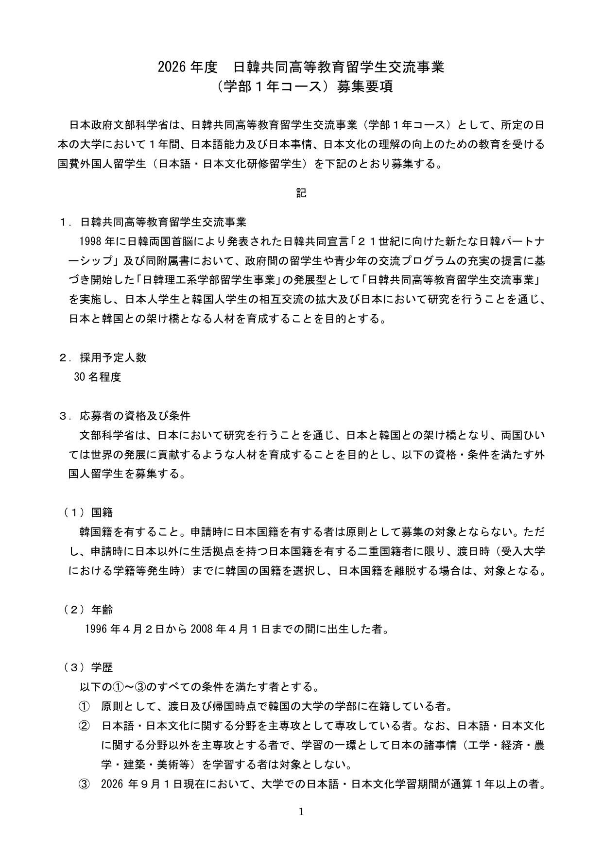 [붙임1] 2026년도 일한공동 고등교육 유학생교류사업 모집요강(학부 1년 코스) 일본어.pdf