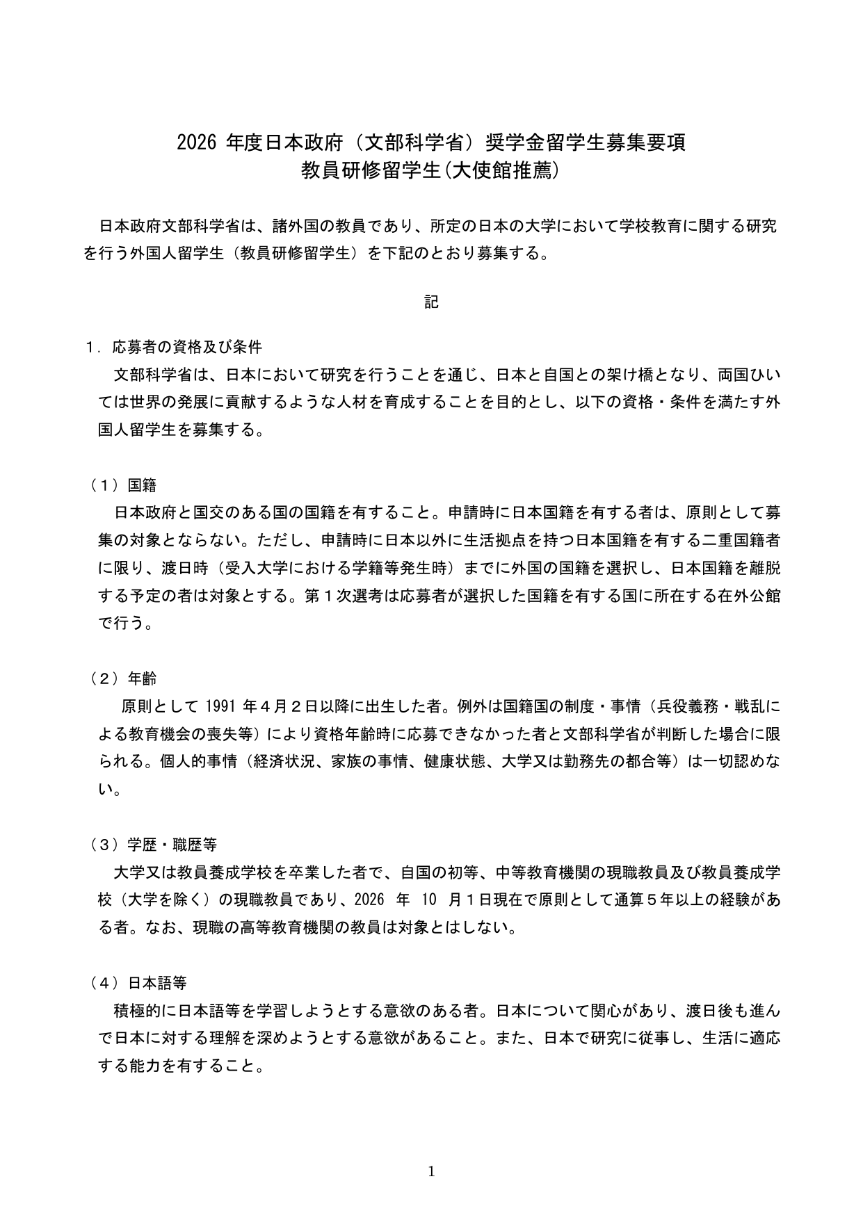 [붙임1-1] 2026년도 일본정부(문부과학성) 장학금 유학생 모집요강(교원 연수 유학생) 일본어.pdf